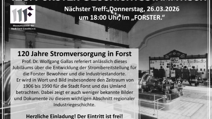 Doch wie fing die Elektrifizierung unserer Stadt und Region eigentlich einmal an? Darüber referiert Prof. Dr. Gallas beim kommenden 128. Geschichtsstammtisch am 26. März um 18 Uhr im FORSTER. Museum für Textil- und Industriegeschichte Lausitz.