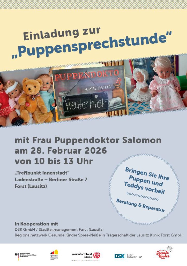 Gefördert wird die Puppensprechstunde durch das Bund-Länder-Programm „Sozialer Zusammenhalt – Zusammenleben im Quartier gemeinsam gestalten“ sowie durch die Stadt Forst (L.).