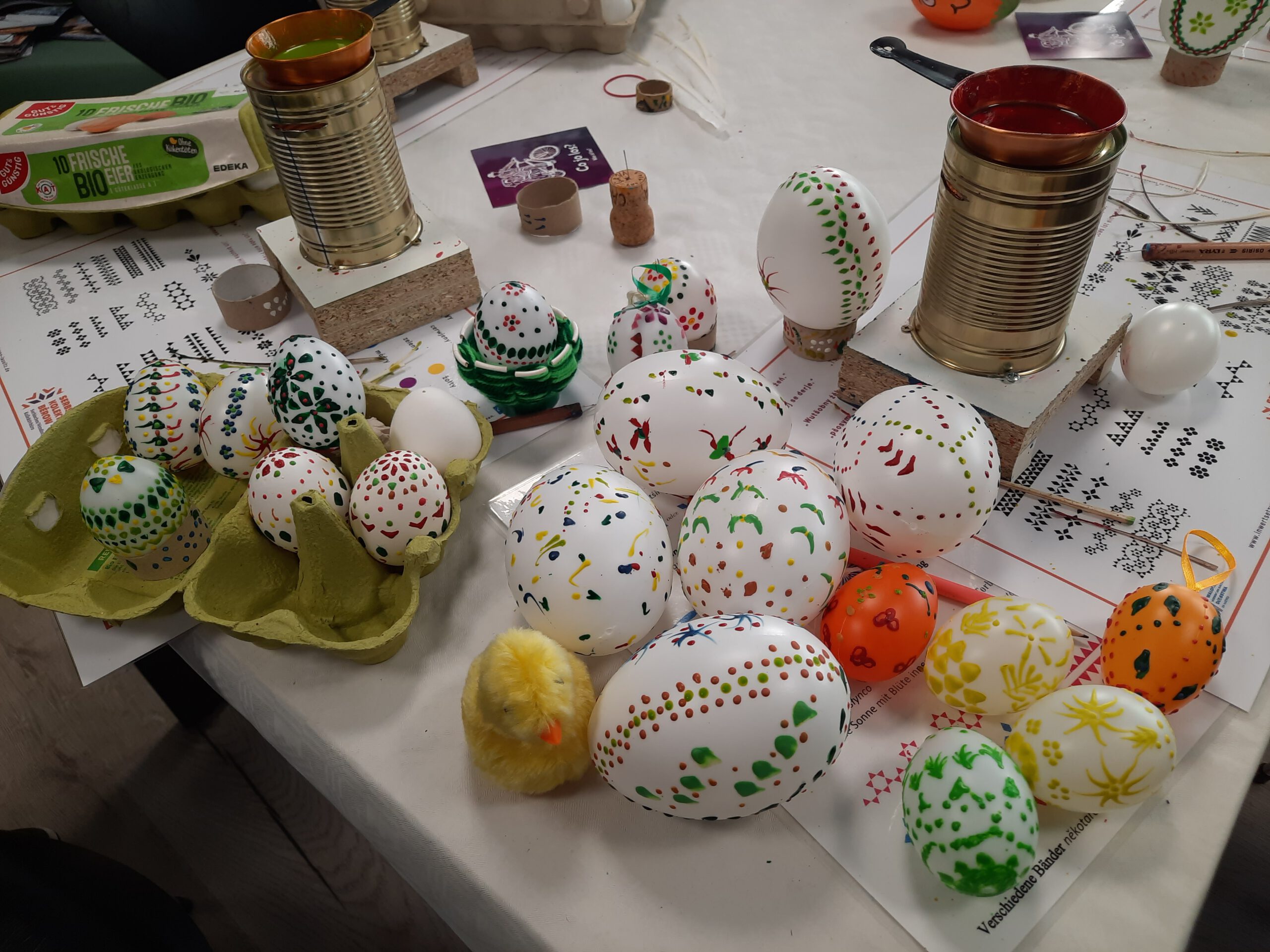 Das Team des Projektes „INWERTSETZUNG“ stellte als Kooperationspartner die Ostereier zur Verfügung. In Kursen im „Treffpunkt Innenstadt“ (DSK/Stadtteilmanagement) in der Ladenstraße, angeboten von der Niedersorbischen Kulturakademie – Dolnoserbska kulturna akademija, erfuhren die Teilnehmenden Wissenswertes über sorbische Bräuche vor allem in der Osterzeit und probierten unter Anleitung die Bossiertechnik mit farbigem Wachs aus. Bei einem Schaufensterbummel in der Berliner Straße sind bereits vielfältige Gestaltungen im Büro der DSK/Treffpunkt Innenstadt zu sehen.