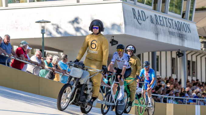 Das Feld wird komplettiert mit Karl Gustav Omann und Nils El Khanji, zwei Nachwuchstalenten, die sowohl hinter den Stehermaschinen als auch hinter dem Derny zu Hause sind.